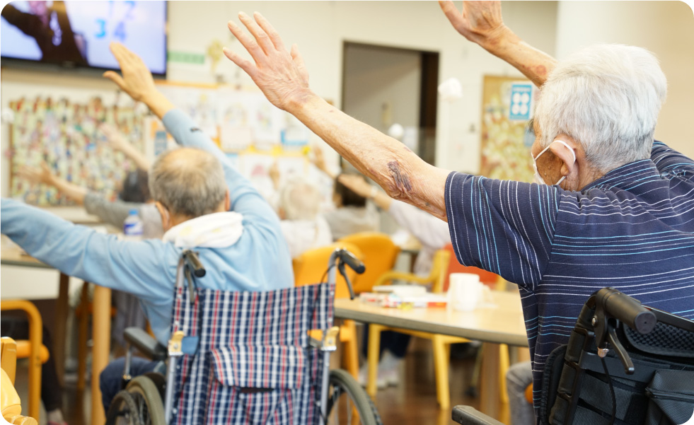 機能訓練やレクリエーションを通して、利用者様ができる限り自立し日常生活を営むことができるよう生活機能の維持又は向上を目指します。個別の機能訓練にも力を入れており、「孫と買い物に行きたい。」など具体的なニーズに合わせた訓練を行っています。また、利用者様だけでなく、家族様の身体的及び精神的負担を軽減できるよう努めます。